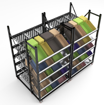 Pallet rack and conveyor removal and relocation in warehouses and distribution centers can result in major labor costs. Solutions to reduce relocation costs include mobile rack systems. Fulfillment and carton flow racks are available in mobile configurations of almost any size. When warehouse layouts are needed the racks can simply be rolled into the new layout location. Timelines are greatly improved without the need for anchors and rack disassembly/re-assembly. Racks as large as 8’W x 8’D can be accommodated in a mobile configuration. Racks can be designed to convey plastic totes, cardboard boxes, or steel containers. Gravity roller conveyors and skate wheel style conveyors are options on all rack systems which are designed for each application. Line-side work cell applications can also be custom designed for assembly and production areas.